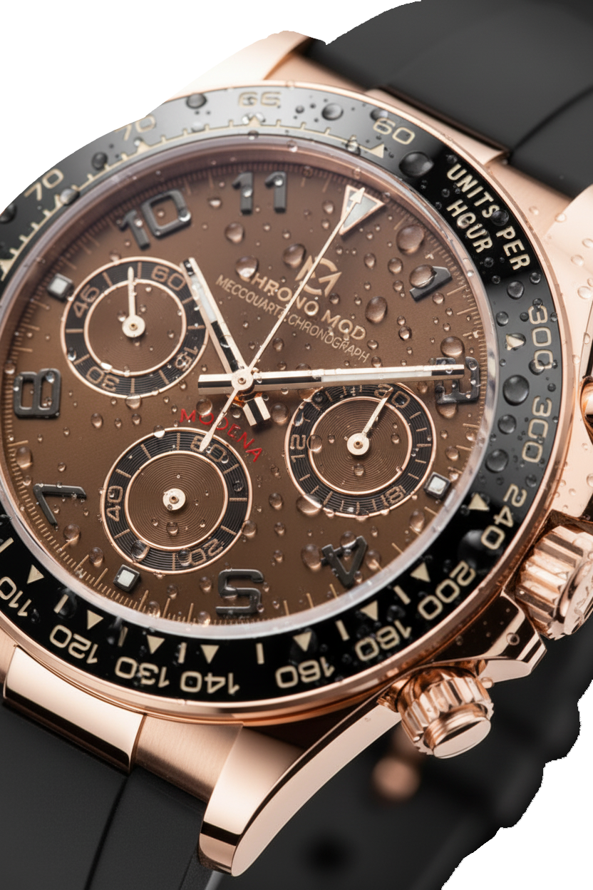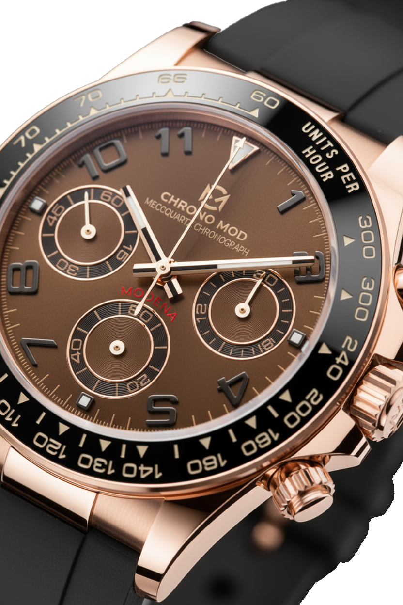 Cada Chrono Mod Modena – Cronógrafo con esfera Chocolate y acabado en oro rosa está ensamblado a mano y probado para precisión, durabilidad y presencia audaz.