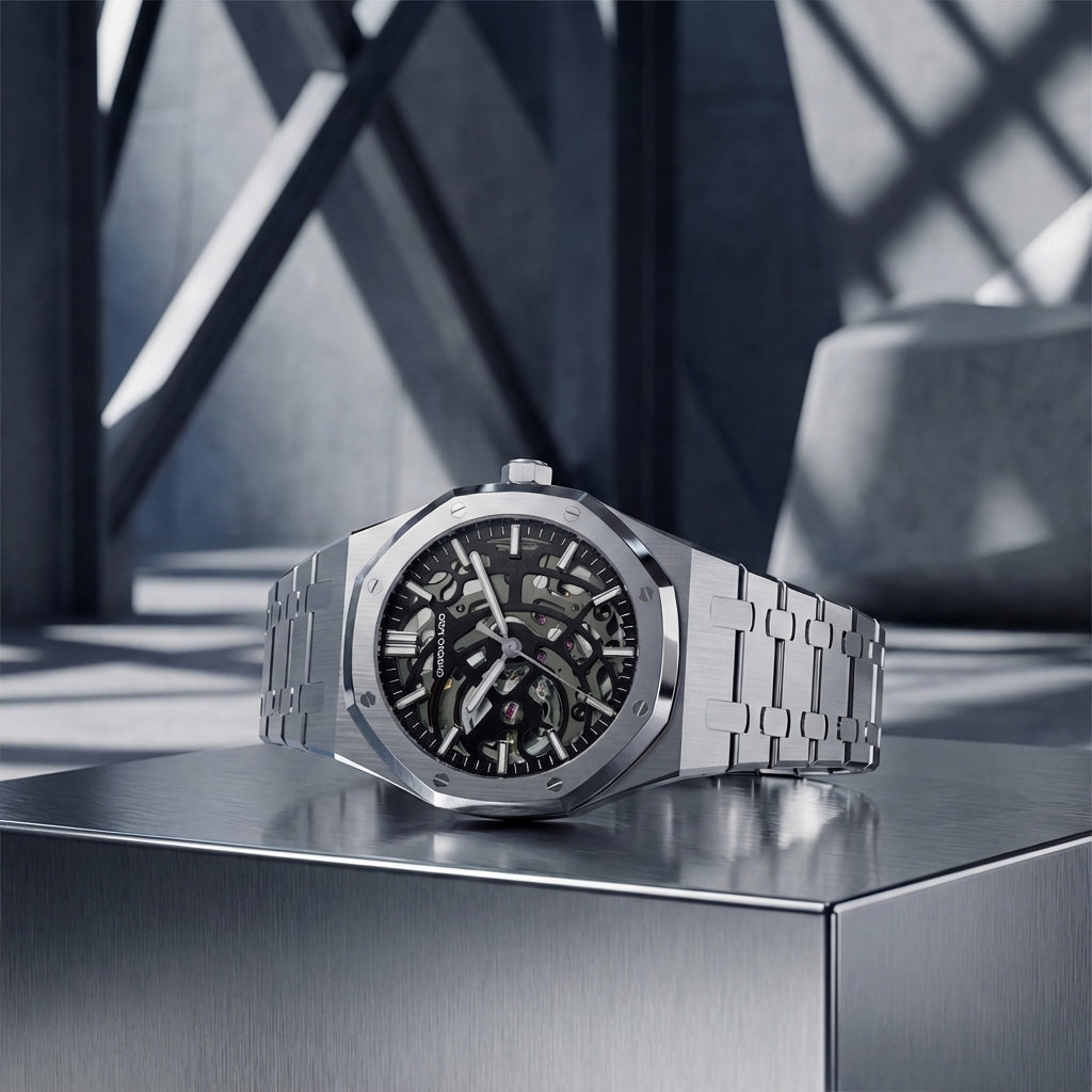 Il personaggio Apex cattura l'essenza dell'orologeria sportiva di lusso moderna: geometria netta, presenza audace e artigianato senza compromessi. Definito dalla sua iconica lunetta ottagonale, viti a vista e spazzolatura verticale precisa, questo design fonde la forza industriale con l'eleganza raffinata. Il suo flusso integrato dalla cassa al bracciale offre un'identità architettonica distintiva, mentre le sue proporzioni sportive ma sofisticate lo rendono immediatamente riconoscibile. L'estetica ispirata ad Apex porta un senso unico di prestigio, struttura e stile contemporaneo a qualsiasi orologio—perfetto per chi apprezza un design che è allo stesso tempo senza tempo e audace.