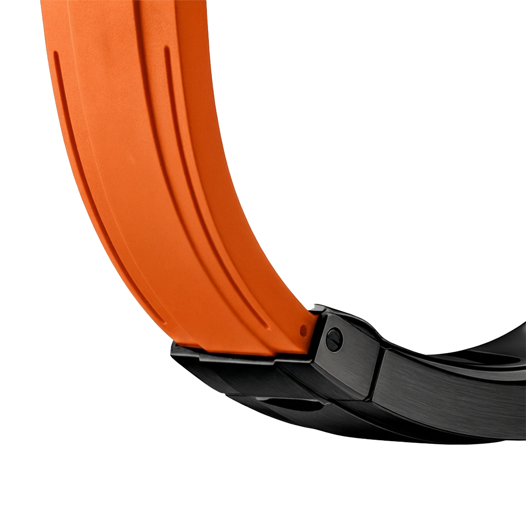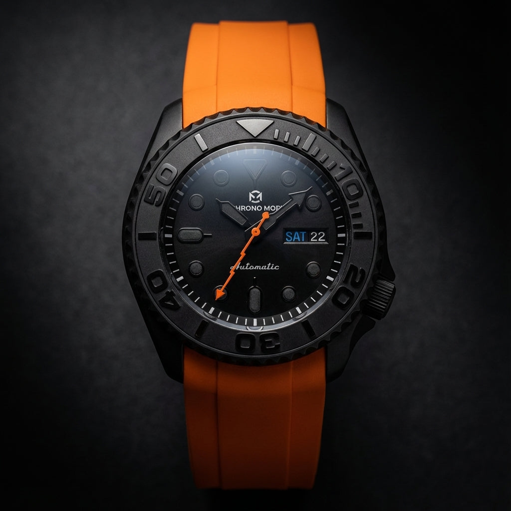 Questo SKX reinventato si distingue per una presenza audace e senza compromessi. La cassa completamente nera opaca e il quadrante nero profondo creano un aspetto tattico moderno, valorizzato da indici rotondi altamente leggibili e da una sorprendente lancetta dei secondi arancione che aggiunge un tocco dinamico e sportivo. Abbinato a un vibrante cinturino in gomma arancione, l'orologio offre un contrasto potente che appare sia robusto che contemporaneo.