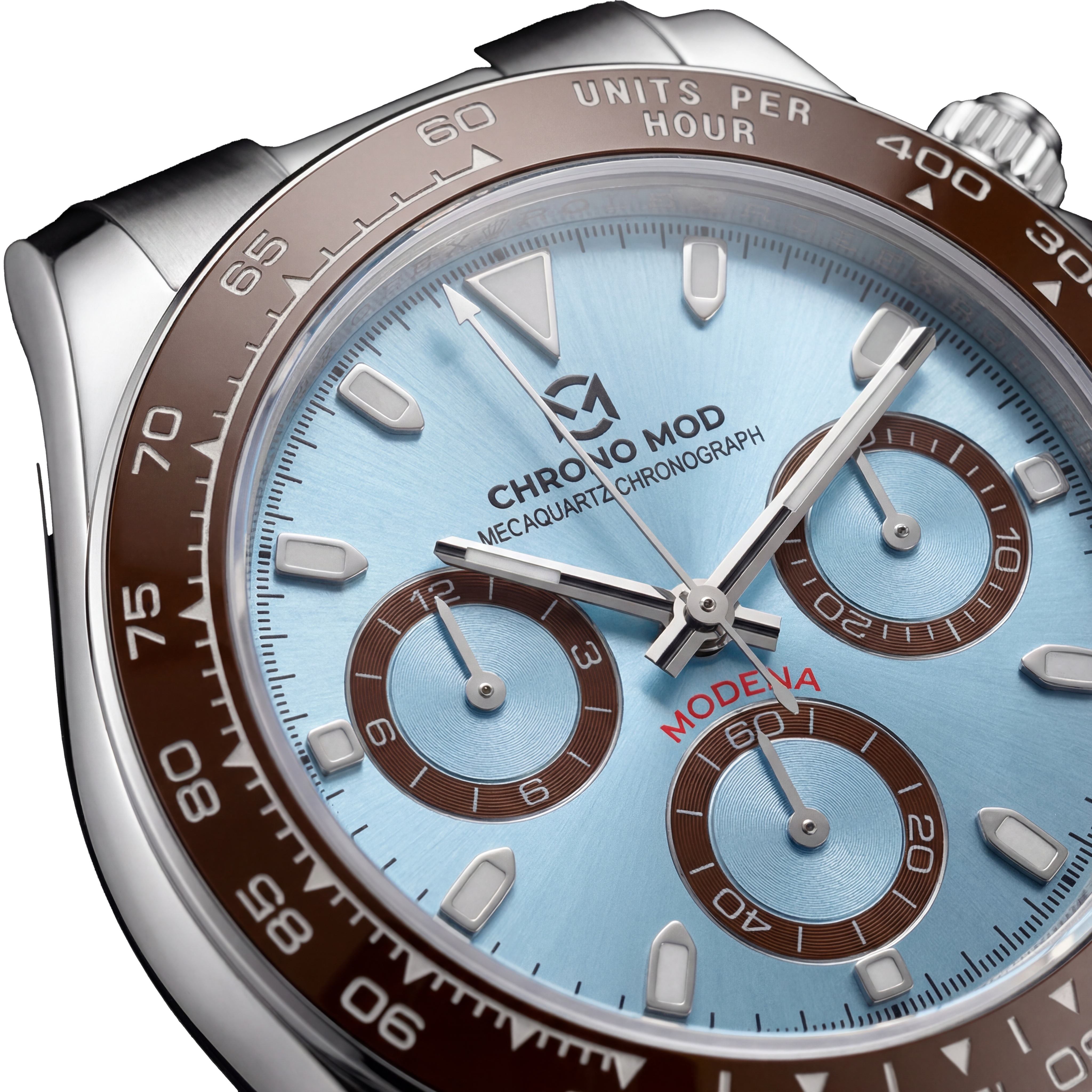 Each Chrono Mod Modena – Platinum Chronograph is hand-assembled and tested for precision, durability, and bold presence.