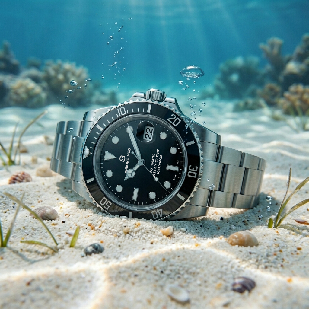 Crafted from 316L stainless steel, protected by a scratch-proof sapphire crystal, and finished with a high-gloss ceramic bezel.