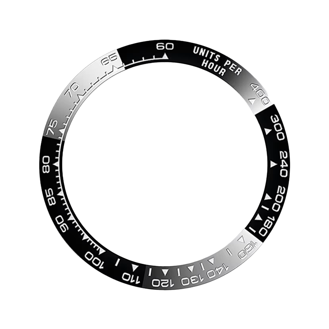 Este anel taquimétrico traz uma elegância quente e inspirada no retro ao seu cronógrafo. Com gravações brancas nítidas, oferece um visual que lembra os icónicos relógios de corrida de herança. Projetado para desempenho, o anel apresenta uma escala taquimétrica precisa, permitindo-lhe medir a velocidade com exatidão enquanto realça o carácter desportivo do relógio.